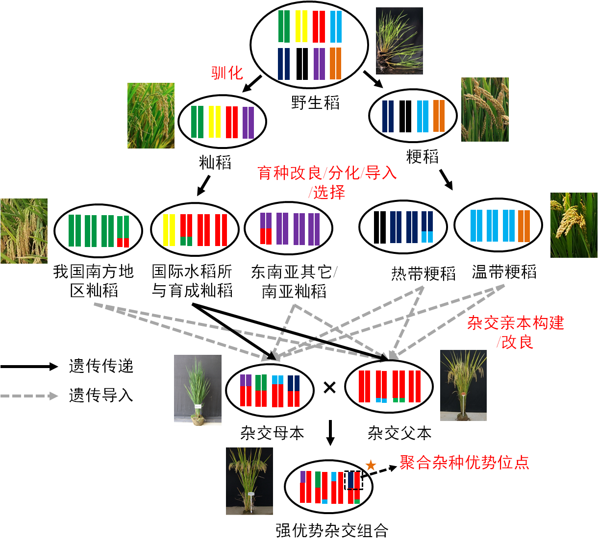 北京大學(xué)現(xiàn)代農(nóng)學(xué)院鄧興旺/何航團(tuán)隊(duì)與湖南亞華種業(yè)科學(xué)院楊遠(yuǎn)柱團(tuán)隊(duì)合作,利用目前商用兩系雜交稻親本構(gòu)建的包含2000個(gè)組合的雜交群體,結(jié)合目前已重測(cè)序的4200余份水稻農(nóng)家種/常規(guī)稻品種基因組信息,進(jìn)行雜種優(yōu)勢(shì)位點(diǎn)鑒定和溯源分析。結(jié)果表明:(1)目前兩系雜交稻父母本均以國(guó)際水稻所育成常規(guī)稻為基礎(chǔ),但存在顯著的遺傳差異:雜交父本含有少量的外源基因組的導(dǎo)入(平均5.74%基因組),而雜交母本含有大量的外源基因組的導(dǎo)入(平均22.57%基因組),外源導(dǎo)入基因組的主要供體為我國(guó)南方地區(qū)常規(guī)稻和粳稻,并且親本基因組導(dǎo)入劑量與雜交后代產(chǎn)量水平關(guān)聯(lián)密切。(2)外源導(dǎo)入基因組差異與雜交稻雜種優(yōu)勢(shì)位點(diǎn)有關(guān),如Ghd8/DTH8、NAL1、IPA1和Gn1a等重要雜種優(yōu)勢(shì)基因都存在父母本差異遺傳導(dǎo)入的現(xiàn)象。其中粳稻血緣貢獻(xiàn)顯著,雖然僅貢獻(xiàn)1.10%父本和2.21%母本基因組,卻影響大約一半的雜種優(yōu)勢(shì)位點(diǎn)。(3)追溯雜種優(yōu)勢(shì)位點(diǎn)變異的形成過(guò)程,發(fā)現(xiàn)其變異在野生稻中就已存在,在水稻群體馴化過(guò)程中受到顯著分化選擇從而形成各個(gè)亞群特異的等位基因,在雜交稻育種過(guò)程中進(jìn)一步聚合分化選擇基因獲得雜種優(yōu)勢(shì)。綜上,該研究從群體進(jìn)化的角度,追溯了雜種優(yōu)勢(shì)位點(diǎn)的遺傳起源,解析育種家如何利用水稻多樣性構(gòu)建雜交親本的遺傳機(jī)制,為強(qiáng)雜種優(yōu)勢(shì)組合親本的構(gòu)建提供理論基礎(chǔ)。