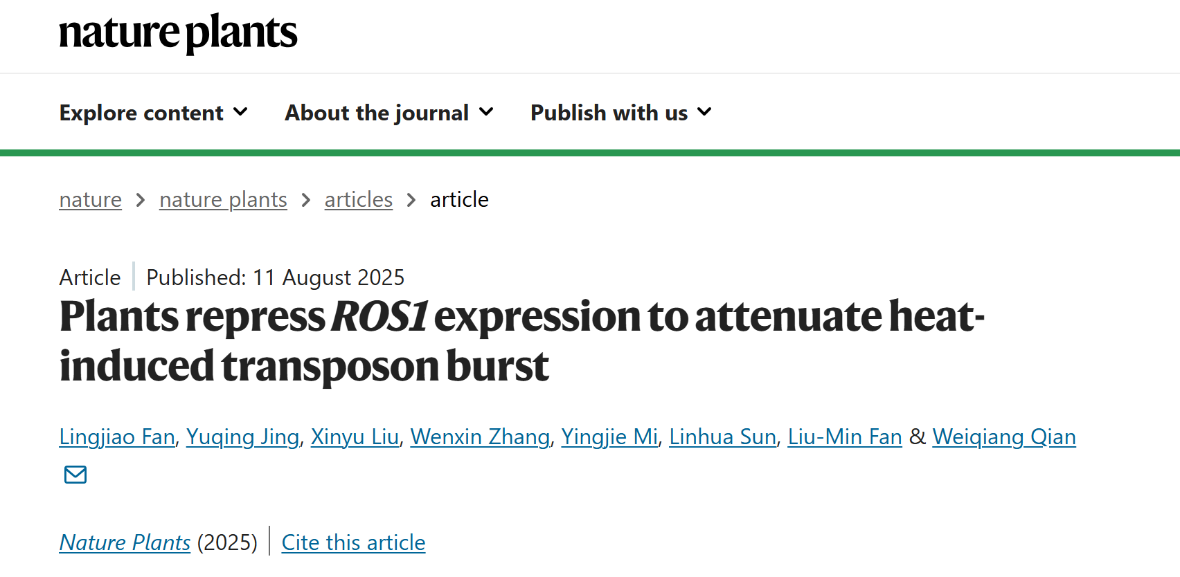 DNA主動去甲基化酶ROS1(Repressor of Silencing 1)在植物發(fā)育和脅迫響應過程中對基因組DNA甲基化模式的調控具有關鍵作用。與經典的DNA甲基化抑制基因表達的機制不同,已有研究表明,ROS1的表達受其啟動子區(qū)域DNA甲基化的正向調控。然而,這些發(fā)現均基于突變體研究,在自然條件下該調控機制是否存在及其生物學功能尚不清楚。近日,北京大學現代農學院錢偉強實驗室發(fā)現,高溫脅迫會降低ROS1啟動子區(qū)域的DNA甲基化水平,并促進內源ROS1位點附近染色質環(huán)的形成,從而抑制ROS1的表達。這一調控機制在植物中發(fā)揮剎車系統的作用,抑制高溫誘導的轉座子過度激活,進而維持基因組穩(wěn)定性。相關研究成果以“Plants repress ROS1 expression to attenuate heat-induced transposon burst”為題,于2025年8月11日在線發(fā)表于國際著名學術期刊《Nature Plants》。