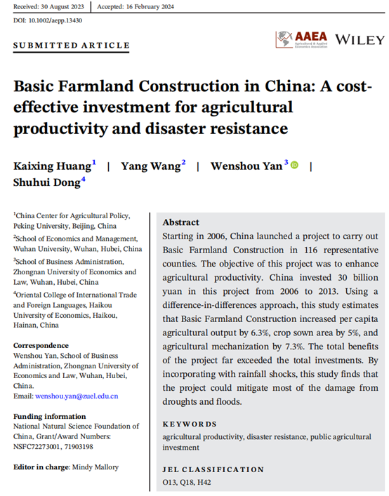 近日,黃開興研究員作為第一作者與合作者在農(nóng)業(yè)與應(yīng)用經(jīng)濟(jì)學(xué)協(xié)會(huì)主辦的期刊Applied Economic Perspectives and Policy發(fā)表論文,對(duì)我國基本農(nóng)田建設(shè)項(xiàng)目在提高農(nóng)業(yè)生產(chǎn)力和抵御災(zāi)害方面進(jìn)行成本收益分析。