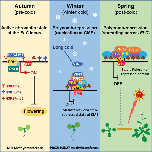 2.Yuan, W., Luo, X., Li, Z., Yang, W., Wang, Y., Liu, R., Du, J., and He, Y. (2016). A cis cold memory element and a trans epigenome reader mediate Polycomb silencing of FLC by vernalization in Arabidopsis. Nat. Genet. 48, 1527-1534.