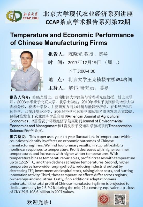 北京大學(xué)現(xiàn)代農(nóng)業(yè)經(jīng)濟(jì)系列講座----CCAP茶點(diǎn)學(xué)術(shù)報(bào)告系列第72期 Temperature and Economic Performance of Chinese Manufacturing Firms 2017-12-20 來源: 作者: