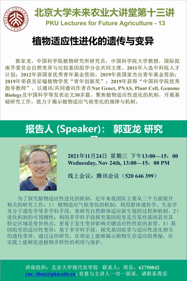 講座通知:北京大學(xué)未來農(nóng)業(yè)大講堂第十三講——植物適應(yīng)性進(jìn)化的遺傳與變異