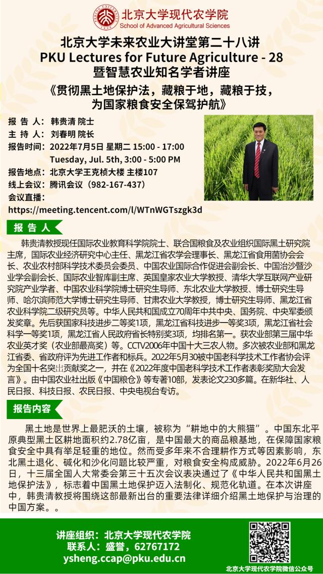 講座通知:北京大學(xué)未來(lái)農(nóng)業(yè)大講堂第二十八講——貫徹黑土地保護(hù)法,藏糧于地,藏糧于技,為國(guó)家糧食安全保駕護(hù)航 2022-07-01 來(lái)源: 作者: