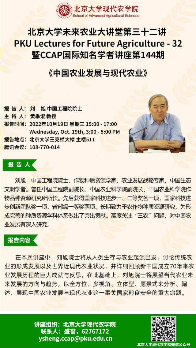 講座通知:北京大學未來農業(yè)大講堂第三十二講——中國農業(yè)發(fā)展與現代農業(yè)