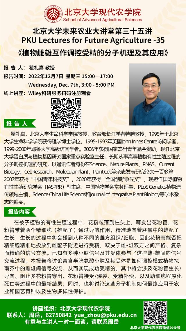 講座通知:北京大學(xué)未來(lái)農(nóng)業(yè)大講堂第三十五講——植物雌雄互作調(diào)控受精的分子機(jī)理及其應(yīng)用