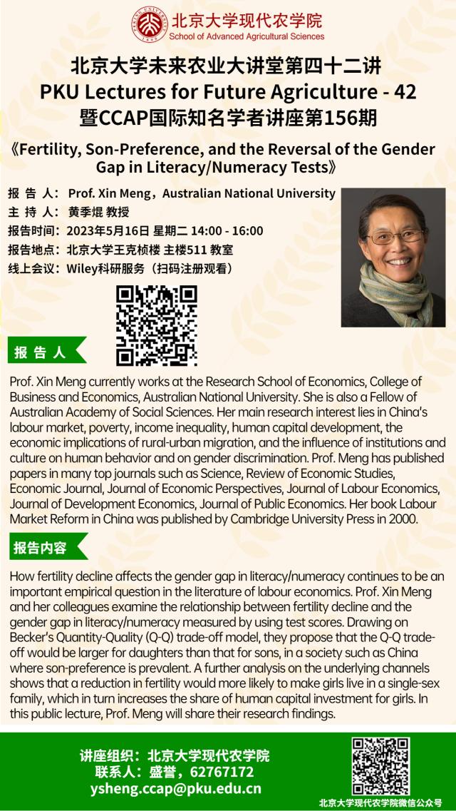 講座通知:北京大學(xué)未來農(nóng)業(yè)大講堂第四十二講——Fertility, Son-Preference, and the Reversal of the Gender Gap in Literacy/Numeracy Tests 2023-05-12 來源: 作者: