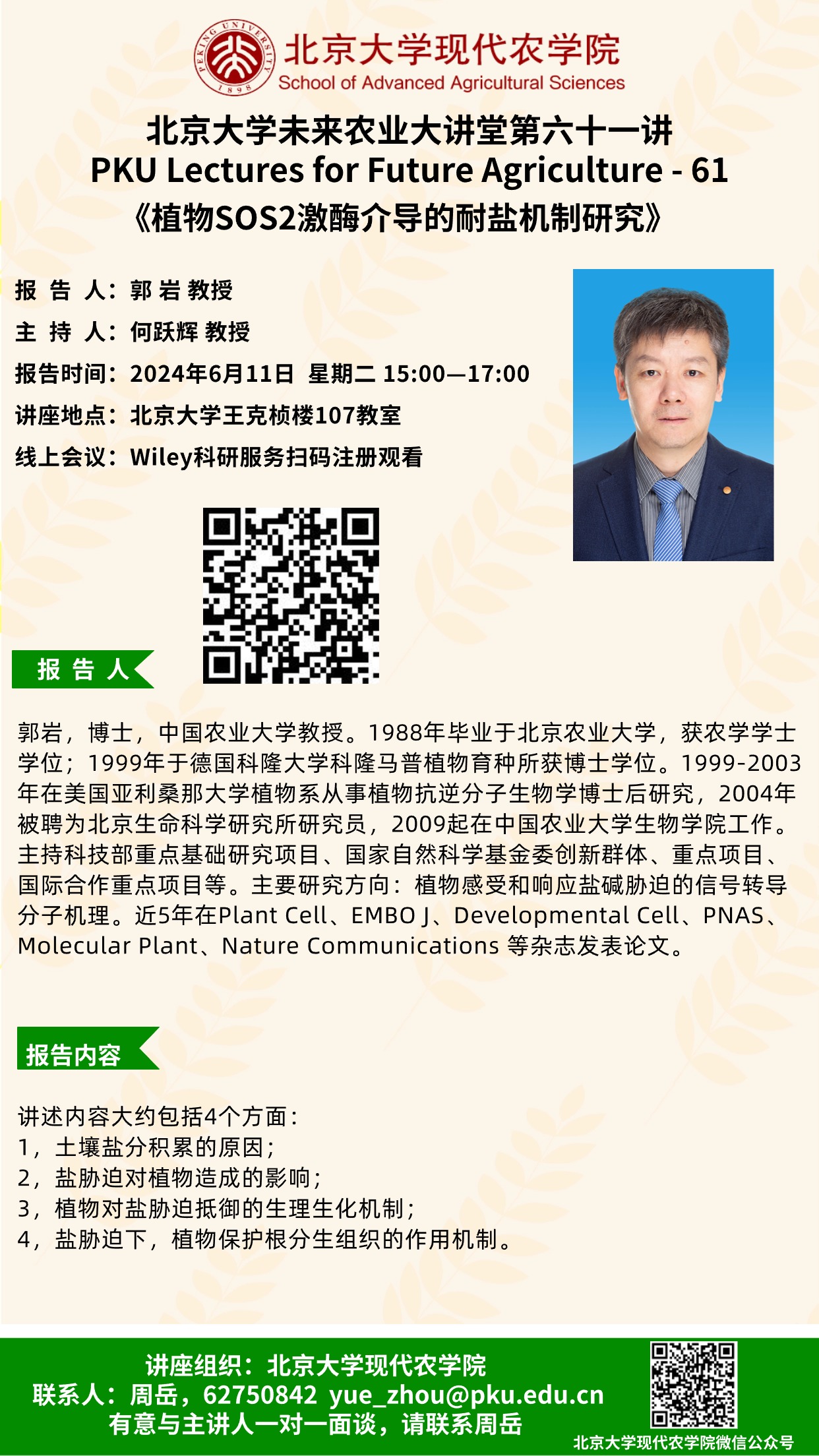 講座通知:北京大學(xué)未來農(nóng)業(yè)大講堂第六十一講——植物SOS2激酶介導(dǎo)的耐鹽機制研究