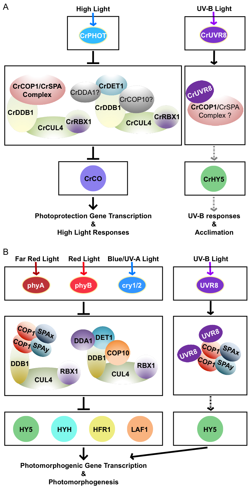 COP/DET/FUS蛋白參與萊茵衣藻(A)和擬南芥(B)光調控途徑
