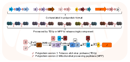 固氮酶系統(tǒng)高度復(fù)雜,需要十幾個基因同時且按特定比例表達(dá)才能實(shí)現(xiàn)其功能性,基因數(shù)量眾多及各基因協(xié)調(diào)表的需求極大的限制了固氮酶系統(tǒng)向真核細(xì)胞的轉(zhuǎn)移。為了解決多基因協(xié)調(diào)表達(dá)的問題,2018年楊建國與王憶平團(tuán)隊借鑒了植物病毒多聚蛋白的策略,利用煙草蝕刻病毒的TEVp蛋白酶,在大腸桿菌底盤中成功將產(chǎn)酸克雷伯菌的鉬鐵固氮酶系統(tǒng)轉(zhuǎn)化為了僅包含5個基因的多聚蛋白型系統(tǒng)(Yang et al., 2018 PNAS)。然而將該系統(tǒng)引入酵母細(xì)胞底盤時,發(fā)現(xiàn)并不能成功的表達(dá)固氮酶的各個組分,通過分析發(fā)現(xiàn)外源蛋白酶TEVp與固氮酶組分共表達(dá)時可能對酵母細(xì)胞產(chǎn)生了潛在的細(xì)胞毒性。為了解決這一新的問題,本研究中選擇了真核細(xì)胞中內(nèi)源且高度保守的線粒體信號肽酶MPP來替代外源蛋白酶TEVp,從而規(guī)避細(xì)胞毒性風(fēng)險。通過設(shè)計和篩選獲得了一組可以被MPP高效識別和切割的僅包含10個氨基酸殘基的序列,基于該序列以及內(nèi)源MPP構(gòu)建了2.0版本的多聚蛋白,并成功在酵母線粒體中實(shí)現(xiàn)了固氮酶組分的高效和協(xié)調(diào)表達(dá)。
