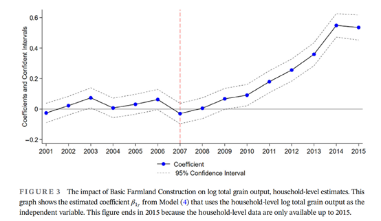 自2006年起,中國首先在116個(gè)縣啟動(dòng)了基本農(nóng)田建設(shè)項(xiàng)目。該項(xiàng)目的目標(biāo)是提高農(nóng)業(yè)生產(chǎn)力。從2006年到2013年,中國在此項(xiàng)目上投資了300億元人民幣。通過采用雙重差分法,本研究估計(jì)基本農(nóng)田建設(shè)使人均農(nóng)業(yè)產(chǎn)出增加了6.3%,播種面積增加了5%,農(nóng)業(yè)機(jī)械化水平提高了7.3%。該項(xiàng)目的總收益遠(yuǎn)超總投資。通過結(jié)合降雨沖擊的分析,本研究發(fā)現(xiàn)該項(xiàng)目能夠緩解大部分由干旱和洪水造成的損害。