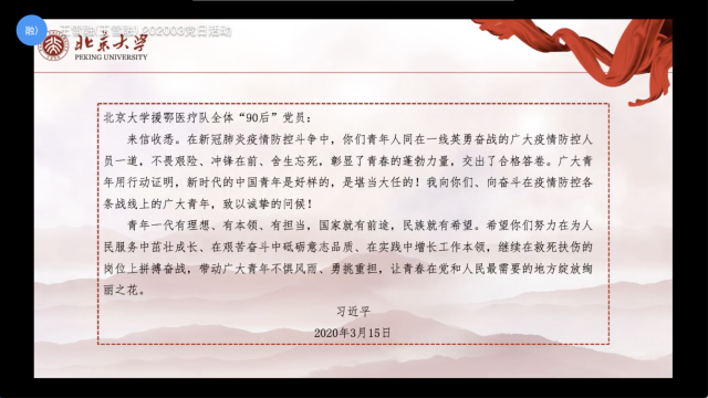 學(xué)生黨支部書(shū)記王雪融主持本次會(huì)議,向大家介紹習(xí)總書(shū)記回信背景、信件內(nèi)容,并組織黨員觀看相關(guān)報(bào)道和前線黨員們奮戰(zhàn)的有關(guān)視頻。
