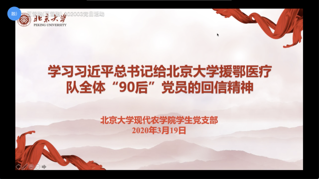 2020年3月18日晚8點(diǎn),現(xiàn)代農(nóng)學(xué)院學(xué)生黨支部召開(kāi)了一次線上黨日活動(dòng),學(xué)習(xí)了習(xí)近平總書(shū)記給北京大學(xué)援鄂醫(yī)療隊(duì)全體“90后”黨員的回信精神,并結(jié)合實(shí)際,分享了自己的心得體會(huì)及在疫情期間的見(jiàn)聞和思考。