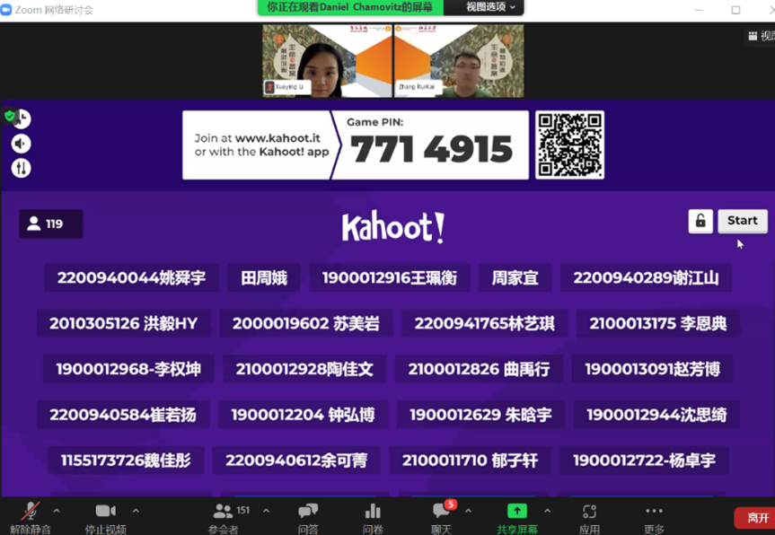 目前,Daniel Chamovitz教授每年在全球范圍內(nèi)只上這一門課。作為一名經(jīng)驗豐富的教授,Daniel教授精心準備了相關(guān)的課程視頻及課件。另外,為了實時了解同學們的學習情況及問題,Daniel采用了kahoot線上答題的方式,極大的增加了老師和同學們的互動,同學們的學習興趣也更加濃厚。在每次課程快結(jié)尾的時候,都會讓同學們通過簡單的小測試來了解自己的學習情況。針對同學們的問題,Daniel和助教都會耐心地在線上回答,并引發(fā)大家的討論。