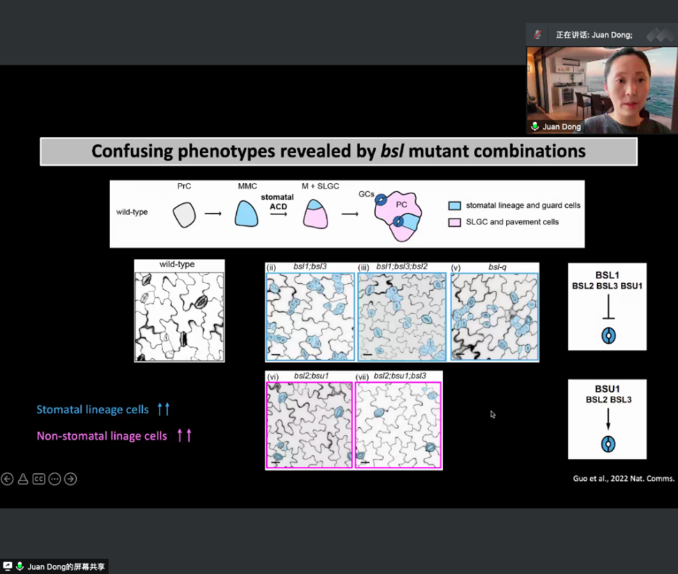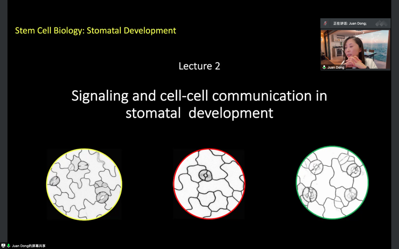 第一天的暑期課程由林辰濤老師主持,董娟老師主講。林老師向大家簡(jiǎn)要介紹了課程的歷史以及本期課程邀請(qǐng)的諸位老師及授課主題,之后董老師帶領(lǐng)大家走進(jìn)植物發(fā)育過(guò)程中的細(xì)胞生物學(xué)領(lǐng)域。上午的課程中,老師講解了植物氣孔發(fā)育的相關(guān)內(nèi)容,重點(diǎn)講解了氣孔細(xì)胞發(fā)育進(jìn)程中3個(gè)核心轉(zhuǎn)錄因子SPCH、MUTE和FAMA的發(fā)現(xiàn)過(guò)程以及作用機(jī)制, 介紹了在感知環(huán)境變化及細(xì)胞間的交流中配體與受體結(jié)合向下游傳遞氣孔發(fā)育信號(hào)的多樣性,如即使是同一個(gè)receptor,TMM,在植物不同的發(fā)育部位對(duì)氣孔發(fā)育的調(diào)控也是不同。