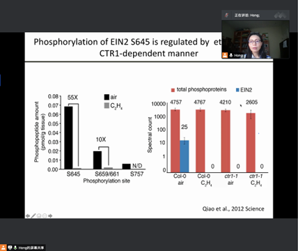 課程中,喬老師介紹了自己實(shí)驗(yàn)室在乙烯信號(hào)轉(zhuǎn)導(dǎo)通路中取得的新進(jìn)展。在課程中,喬老師通過(guò)線上連麥的方式與同學(xué)們互動(dòng),鼓勵(lì)同學(xué)們勇敢展現(xiàn)自己,課堂氛圍活躍,喬老師為同學(xué)們答疑解惑、同時(shí)還分享了自己科研生涯的寶貴經(jīng)驗(yàn)。