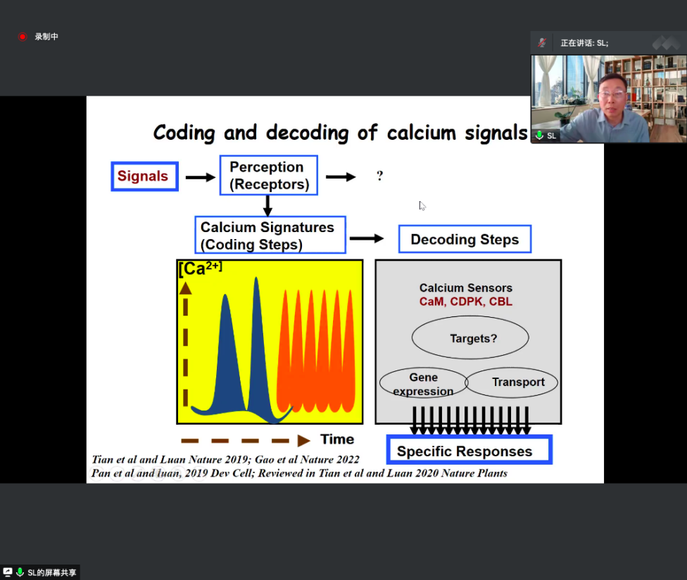 上午的研討會(huì)由林辰濤老師主持。首先由王志勇老師為大家講述糖和植物激素對(duì)植物生長(zhǎng)發(fā)育的調(diào)控,主要介紹了負(fù)責(zé)蛋白糖基化修飾的SPY和SEC所介導(dǎo)的GA和BR信號(hào)轉(zhuǎn)導(dǎo)機(jī)制及其對(duì)植物生長(zhǎng)發(fā)育的影響。此外王老師也列舉了研究中鑒定到的大量SPY和SEC的互作蛋白,涉及了根的發(fā)育、晝夜節(jié)律、開(kāi)花、植物免疫等多個(gè)方面,也包括植物激素、環(huán)境信號(hào)等多種內(nèi)外界信號(hào)途徑的因子,暗示了糖信號(hào)以及糖基轉(zhuǎn)移酶SPY和SEC對(duì)植物生長(zhǎng)發(fā)育的重要調(diào)控作用,也為其他學(xué)者提供了豐富的研究線索。接著欒升老師介紹了第二信使Ca2+對(duì)植物營(yíng)養(yǎng)吸收的調(diào)控,重點(diǎn)介紹了Ca2+受體CBLs和CIPKs的差異性互作對(duì)于植物鉀吸收的特異性調(diào)控。喬紅老師講述了乙烯信號(hào)轉(zhuǎn)導(dǎo)的表觀調(diào)控機(jī)制,介紹了以EIN2、EIN3為核心的ENAP1及SRT1和SRT2參與的組蛋白乙酰化和去乙酰化過(guò)程,也發(fā)現(xiàn)了一個(gè)新的轉(zhuǎn)錄抑制因子Tree1,闡明了乙烯響應(yīng)中轉(zhuǎn)錄激活和轉(zhuǎn)錄抑制的機(jī)制。董娟老師接著前期課程中的強(qiáng)烈安利,介紹了她們課題組的最新進(jìn)展,除蛋白磷酸酶BSL1時(shí)空特異的極性聚集于細(xì)胞膜上從而調(diào)節(jié)氣孔細(xì)胞命運(yùn)轉(zhuǎn)變外,也發(fā)現(xiàn)不同亞細(xì)胞定位的蛋白磷酸酶BSL家族通過(guò)去磷酸化不同的MAPK信號(hào)級(jí)聯(lián)途經(jīng)組分,最終差異性地調(diào)控SPEH蛋白穩(wěn)定性從而影響氣孔形成的機(jī)制。最后鐘上威老師介紹了phyB區(qū)分光照和溫度這兩個(gè)重要環(huán)境因子的機(jī)制,發(fā)現(xiàn)光照和溫度可以影響phyB相分離的形成和解離,phyB感知光照時(shí)依賴于構(gòu)象的變化解除N端對(duì)C端的抑制從而通過(guò)C端寡聚化驅(qū)動(dòng)相分離,而溫度的感知不依賴于構(gòu)象變化,通過(guò)NTE結(jié)構(gòu)域直接感知溫度變化并動(dòng)態(tài)調(diào)控phyB的相分離從而實(shí)現(xiàn)溫度感知。