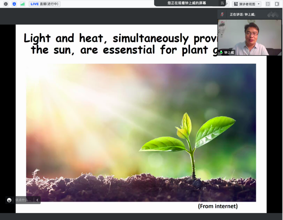 最后一天的暑期課程由鄧興旺老師講授。鄧?yán)蠋熓紫冉榻B了中國(guó)農(nóng)業(yè)發(fā)展的歷史及現(xiàn)狀,農(nóng)業(yè)農(nóng)村農(nóng)民正處于發(fā)展新時(shí)代,北京大學(xué)現(xiàn)代農(nóng)業(yè)研究院應(yīng)運(yùn)而生,關(guān)注農(nóng)業(yè)發(fā)展、關(guān)心農(nóng)村建設(shè)、關(guān)注農(nóng)民福祉。2022年7月10日是北京大學(xué)現(xiàn)代農(nóng)業(yè)研究院于山東省濰坊市正式啟用一周年之際,鄧?yán)蠋煘槲覀兘榻B了一年來(lái)現(xiàn)代農(nóng)業(yè)研究院的建設(shè)與發(fā)展,在不斷發(fā)展與進(jìn)步中通過(guò)科學(xué)技術(shù)的創(chuàng)新實(shí)現(xiàn)“金飯碗”、“菜籃子”、“油桶子”的國(guó)家戰(zhàn)略。隨后,鄧?yán)蠋煄覀冏哌M(jìn)了神奇的植物世界,展示了自然界豐富多樣的植物以及其響應(yīng)外界環(huán)境變化的奇妙現(xiàn)象,有些植物單單存在就美麗,有魅力;群聚而棲時(shí),有智慧,懂謙讓;植物作為地球上唯一的生產(chǎn)者,提供能量,無(wú)私奉獻(xiàn)。鄧?yán)蠋煂?duì)不同植物的神奇現(xiàn)象的介紹,激發(fā)了同學(xué)們對(duì)植物的好奇和學(xué)習(xí)興趣,開(kāi)拓了眼界。