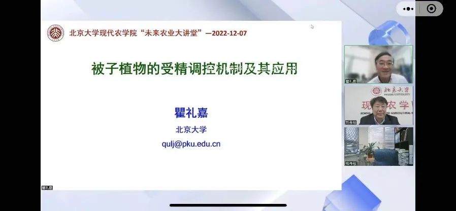 2022年12月7日(星期三)下午,北京大學(xué)現(xiàn)代農(nóng)學(xué)院未來農(nóng)業(yè)大講堂邀請北京大學(xué)蛋白質(zhì)與植物基因研究國家重點(diǎn)實(shí)驗(yàn)室主任,北京大學(xué)生命科學(xué)學(xué)院瞿禮嘉教授,做了題為“植物雌雄互作調(diào)控受精的分子機(jī)理及其應(yīng)用”的報(bào)告。報(bào)告由北京大學(xué)現(xiàn)代農(nóng)學(xué)院院長劉春明教授主持,來自校內(nèi)外7000余名師生線上觀看瞿老師的精彩報(bào)告。報(bào)告圍繞花粉管的演化生物學(xué)地位、花粉管定點(diǎn)爆炸、花粉管導(dǎo)航至胚珠處受精、防止多精受精機(jī)制、啟動(dòng)宿存助細(xì)胞死亡、被子植物雙受精的優(yōu)先性六個(gè)方面展開,最后提出把雌雄配子互作的分子機(jī)制應(yīng)用于農(nóng)業(yè)和園藝育種的長遠(yuǎn)目標(biāo)。