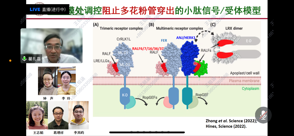 瞿禮嘉老師還講到,在動(dòng)物受精過程中,常會(huì)發(fā)生多個(gè)精子與卵子融合現(xiàn)象,引起胚胎細(xì)胞的基因組紊亂,導(dǎo)致胚胎發(fā)育終止。因此,動(dòng)物中有非常嚴(yán)格的控制機(jī)制防止“多精受精”。而在被子植物中有大量的花粉管在花柱道中生長,因此,被子植物中防止“多精受精”的控制機(jī)制就很大程度上轉(zhuǎn)變成限制多根花粉管從隔膜穿出靶向同一個(gè)胚珠。瞿老師團(tuán)隊(duì)首先鑒定到在雌蕊花柱道隔膜處表達(dá)的三個(gè)受體FERONIA、ANJEA和HERK1,這三個(gè)受體在膈膜處建立不讓“多花粉管穿出”的“屏障”,同時(shí)瞿老師團(tuán)隊(duì)又鑒定到花粉管分泌的五個(gè)小肽RALF6、7、16、36和37是這三個(gè)受體的配體信號(hào)分子,也參與到該過程中,首次闡明了在花柱道隔膜處防止多花粉管穿出屏障的建立是依賴于雌-雄雙方的相互作用,揭示了擬南芥中防止多花粉管受精的分子機(jī)制。