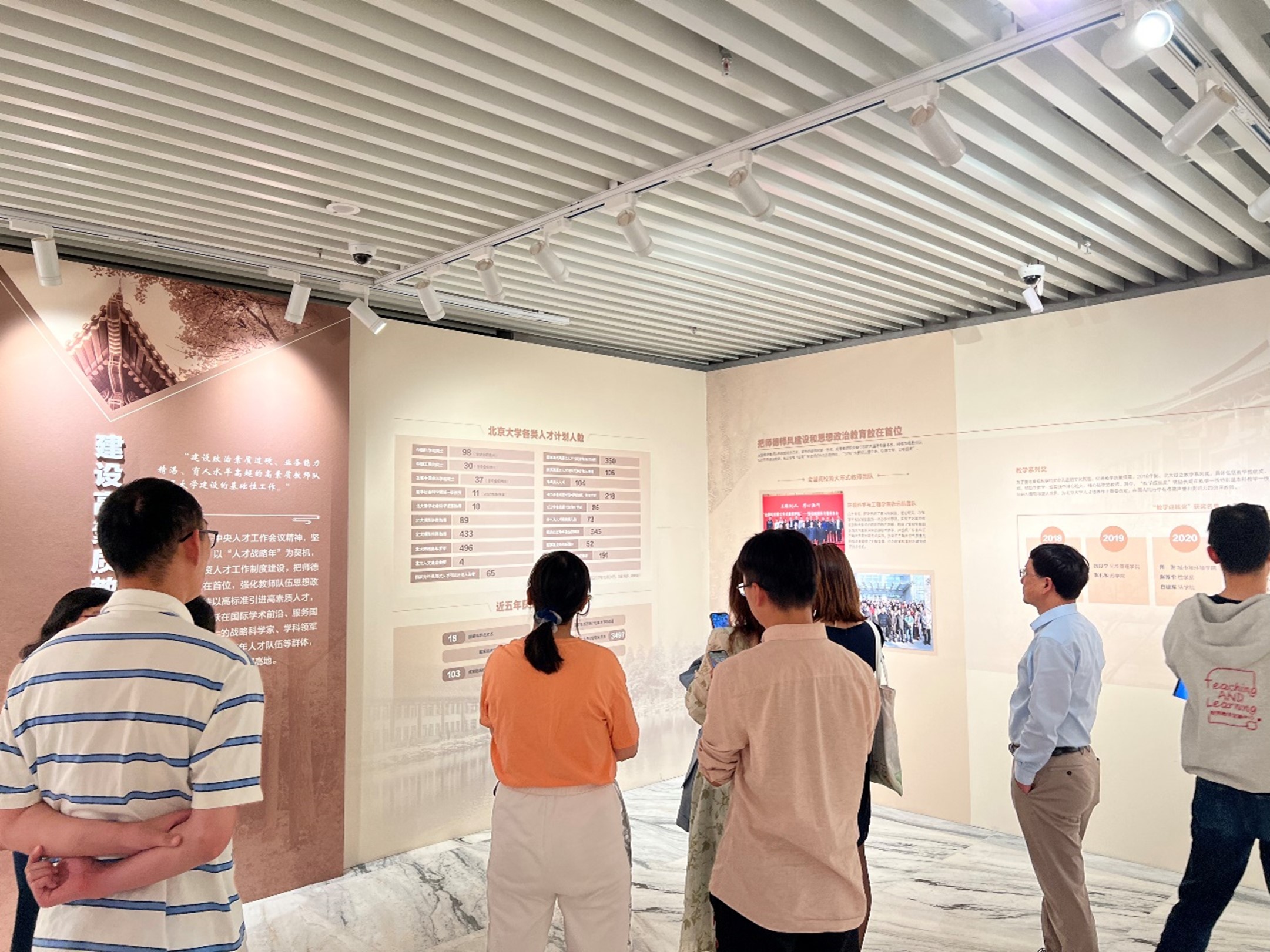 展覽選取了習(xí)近平總書記“5·2”重要講話中“同人民一起開拓 同祖國一起奮進(jìn)”作為主題,緊密圍繞習(xí)近平總書記“5·2”重要講話內(nèi)容,全面展現(xiàn)近年來北京大學(xué)勇?lián)姑㈨频Z前行,開創(chuàng)高等教育高質(zhì)量發(fā)展新局面、推進(jìn)中國特色世界一流大學(xué)建設(shè)進(jìn)程的發(fā)展建設(shè)成就,回顧了北京大學(xué)建校125年來全面引領(lǐng)、推動和融入中國式現(xiàn)代化進(jìn)程的相關(guān)重要?dú)v史場景。