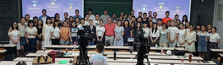 本次暑期課的教學(xué)方式也更加注重老師與學(xué)生的互動(dòng),現(xiàn)代而又高效。查莫維茨教授以精心準(zhǔn)備的教學(xué)課件,結(jié)合自身豐富的肢體動(dòng)作,力求將每個(gè)植物學(xué)知識(shí)點(diǎn)都講的生動(dòng)有趣且易于理解。學(xué)員們?cè)谡n堂上積極發(fā)言,敢于表達(dá)與查莫維茨教授不同的觀點(diǎn),平等交流且理性討論,在輕松愉快的氛圍中培養(yǎng)了學(xué)員們獨(dú)立思考的能力,一定程度上促進(jìn)了學(xué)員們辯證性思維習(xí)慣的養(yǎng)成。不僅如此,查莫維茨教授首次將在線互動(dòng)式游戲與課堂作業(yè)結(jié)合起來(lái),使得課堂作業(yè)不再枯燥乏味,將課后作業(yè)在每節(jié)課最后的幾分鐘內(nèi)變成了類似電視上的益智類競(jìng)猜節(jié)目。在緊張卻又生動(dòng)的類似007一樣的背景音樂(lè)下,學(xué)員們利用自己的手機(jī),在鍵盤上敲擊問(wèn)題答案,隨后發(fā)送到大屏幕上,以這種方式將師生關(guān)系進(jìn)一步拉近,使得課堂從傳統(tǒng)的“一言堂”變成了現(xiàn)代的互動(dòng)式的教育模式,寓教于樂(lè),不僅確保學(xué)員的聽課質(zhì)量,也大大提高了參與課堂的意愿和興趣。