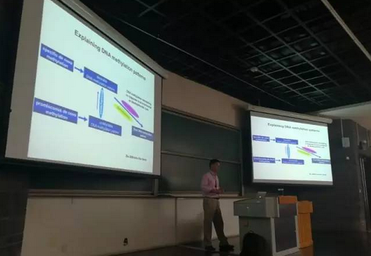 在下午的課程中,朱老師首先向同學們介紹了DNA是遺傳物質的發(fā)現過程以及遺傳信息的傳遞和表觀遺傳的相關背景。接下來朱老師系統(tǒng)地介紹了RdDM途徑介導的DNA甲基化過程,以及利用他們建立的熒光素酶篩選系統(tǒng)篩選到了第一個去甲基化酶ROS1,以及利用蔗糖抑制根長篩選體系篩選到了去甲基化復合體中的其它的組分,從而確立了在擬南芥中至少有兩條獨立的信號通路調控去甲基化過程,同時ROS1自身啟動子的甲基化水平可以作為植物體內甲基化和去甲基化的開關。最后朱老師詳細地介紹了他們在西紅柿中的最新研究成果,研究表明冷處理等可以抑制去甲基化酶ROS1的表達,從而使得控制風味相關的基因高甲基化,進而低表達,使得西紅柿的口感不佳。這一研究具有相當使用的生產應用價值。報告結束后同學們十分興奮與朱老師進行了更多的討論。