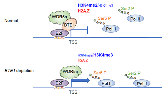 鄧興旺實(shí)驗(yàn)室朱丹萌課題組在對(duì)于植物特有非編碼RNA HID1的研究中,發(fā)現(xiàn)擬南芥中HID1基因座下游1.8 kb的位置存在一個(gè)功能冗余的同源基因HIL1。野生型中HIL1的表達(dá)水平顯著低于HID1,提示HIL1位點(diǎn)可能存在特異的轉(zhuǎn)錄抑制調(diào)控。通過(guò)正向遺傳學(xué)篩選,課題組鑒定到一個(gè)植物DREAM復(fù)合體的特有亞基BTE1 (barrier of transcription elongation 1 ),其功能缺失能夠回復(fù)hid1突變體幼苗發(fā)育遲滯表型至野生型。hid1 bte1的表型回復(fù)主因是HIL1的轉(zhuǎn)錄抑制釋放。進(jìn)一步研究發(fā)現(xiàn)BTE1抑制基因組中上百個(gè)基因的轉(zhuǎn)錄。借助遺傳篩選獲得的hid1表型回復(fù)顯性突變株,研究發(fā)現(xiàn)BTE1主要由E2F轉(zhuǎn)錄因子招募至靶基因啟動(dòng)子區(qū)。BTE1靶基因染色質(zhì)轉(zhuǎn)錄起始位點(diǎn)附近呈現(xiàn)顯著的組蛋白H3K4me2修飾富集。BTE1的功能缺失可造成靶基因轉(zhuǎn)錄起始位點(diǎn)H3K4me3修飾水平顯著上升。有意思的是,BTE1可與COMPASS-like復(fù)合物核心骨架蛋白WDR5A直接互作,抑制WDR5A對(duì)于靶基因染色質(zhì)的結(jié)合和Pol II介導(dǎo)的轉(zhuǎn)錄延伸。分子演化分析顯示,BTE1是植物特有基因,其與同源基因BTL1產(chǎn)生于β全基因組復(fù)制事件。它們是對(duì)抗DNA損傷脅迫的關(guān)鍵因子。