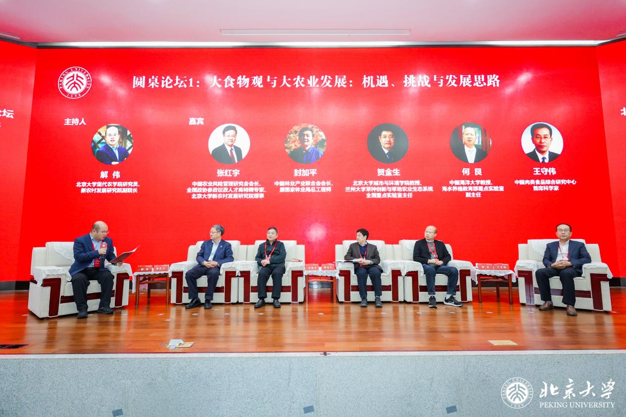 圓桌論壇一的主題為“大食物觀與大農(nóng)業(yè)發(fā)展:機(jī)遇、挑戰(zhàn)與發(fā)展思路”,由北京大學(xué)現(xiàn)代農(nóng)學(xué)院副教授、新農(nóng)村發(fā)展研究院副院長解偉主持。此次圓桌論壇邀請中國農(nóng)業(yè)風(fēng)險管理研究會會長、全國政協(xié)參政議政人才庫特聘專家、北京大學(xué)新農(nóng)村發(fā)展研究院理事張紅宇,中國林業(yè)產(chǎn)業(yè)聯(lián)合會會長、原國家林業(yè)局總工程師封加平,北京大學(xué)城市與環(huán)境學(xué)院教授、蘭州大學(xué)草種創(chuàng)新與草地農(nóng)業(yè)生態(tài)系統(tǒng)全國重點實驗室主任賀金生,中國海洋大學(xué)教授、海水養(yǎng)殖教育部重點實驗室副主任何艮,中國肉類食品綜合研究中心首席科學(xué)家王守偉等與談嘉賓,從農(nóng)區(qū)、草地、林地、海洋、未來食物等五大食物生產(chǎn)系統(tǒng)的發(fā)展現(xiàn)狀、潛力、目前面臨的挑戰(zhàn)等方面進(jìn)行分享交流。