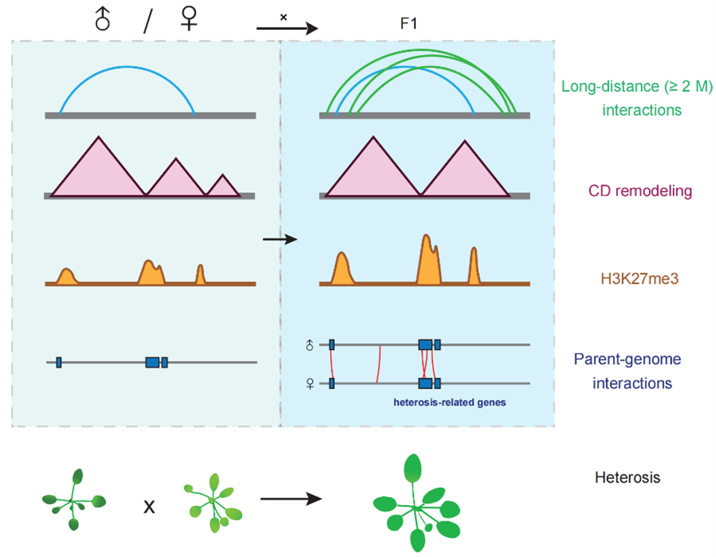 除了單細(xì)胞方向的研究,她還和合作者利用模式植物擬南芥為研究載體,探究雜種中三維基因組結(jié)構(gòu)變化及其對雜種優(yōu)勢的影響。通過結(jié)合Hi-C、RNA-seq和ChIP-seq技術(shù),系統(tǒng)探究了雜種中三維基因組結(jié)構(gòu)變化及其對雜種優(yōu)勢的影響。相關(guān)研究結(jié)果已經(jīng)順利于2024年2月在Journal of Integrative Plant Biology期刊上發(fā)表。