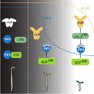 光提供了植物生長所需要的能量,同時作為核心環(huán)境信號因子調(diào)控著植物各個階段的生長發(fā)育。此前,通過篩選與光受體相互作用的因子,人們鑒定到光信號通路的核心轉(zhuǎn)錄因子Phytochrome Interacting Factor 3 (PIF3)。在暗中,PIF3穩(wěn)定存在,利于植物在土壤等暗環(huán)境中的生長;見光后,PIF3迅速降解,伴隨著啟動植物的光形態(tài)建成等生命過程。PIF3在暗中的積累以及見光后的迅速降解對于植物在不同光環(huán)境中的生存具有決定意義,它的穩(wěn)定性如何受調(diào)控一直是植物光信號轉(zhuǎn)導(dǎo)領(lǐng)域的核心科學(xué)問題。CRL3LRBs是已報道的促進PIF3降解的E3連接酶,然而遺傳學(xué)分析表明CRL3LRBs是光形態(tài)建成的負調(diào)控因子,它們可同時降解PIF3及紅光受體phyB [Science 344, 1160-1164(2014)]。因此,CRL3LRBs的主要功能可能是促進phyB的降解從而削弱光信號作用。