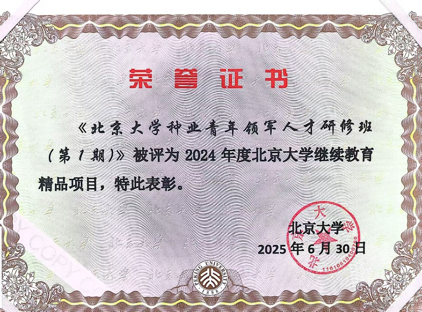 “種子是農(nóng)業(yè)的芯片。”黨的十八大以來,習近平總書記高度重視中國種業(yè)發(fā)展,明確指出“必須下決心把我國種業(yè)搞上去,實現(xiàn)種業(yè)科技自立自強、種源自主可控”。在這一重要戰(zhàn)略指引下,北京大學現(xiàn)代農(nóng)學院積極擔當,勇于創(chuàng)新,于2024年成功舉辦的首期“北京大學種業(yè)青年領(lǐng)軍人才研修班(1期)”近日榮膺“北京大學繼續(xù)教育精品項目”稱號,這是對項目質(zhì)量與影響力的高度認可,更是北大農(nóng)學服務(wù)國家戰(zhàn)略、培養(yǎng)種業(yè)領(lǐng)軍人才的重要里程碑。