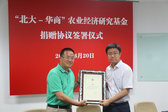 2017年6月20日下午,“北大-華商”農(nóng)業(yè)經(jīng)濟(jì)研究基金捐贈協(xié)議簽署儀式在北京大學(xué)王克楨樓454會議室舉行。華商基金管理公司及公司總經(jīng)理梁永強(qiáng)先生向北京大學(xué)現(xiàn)代農(nóng)學(xué)院共同捐資設(shè)立北大華商農(nóng)業(yè)經(jīng)濟(jì)研究基金,用于支持農(nóng)業(yè)經(jīng)濟(jì)管理學(xué)科的建設(shè)和發(fā)展。