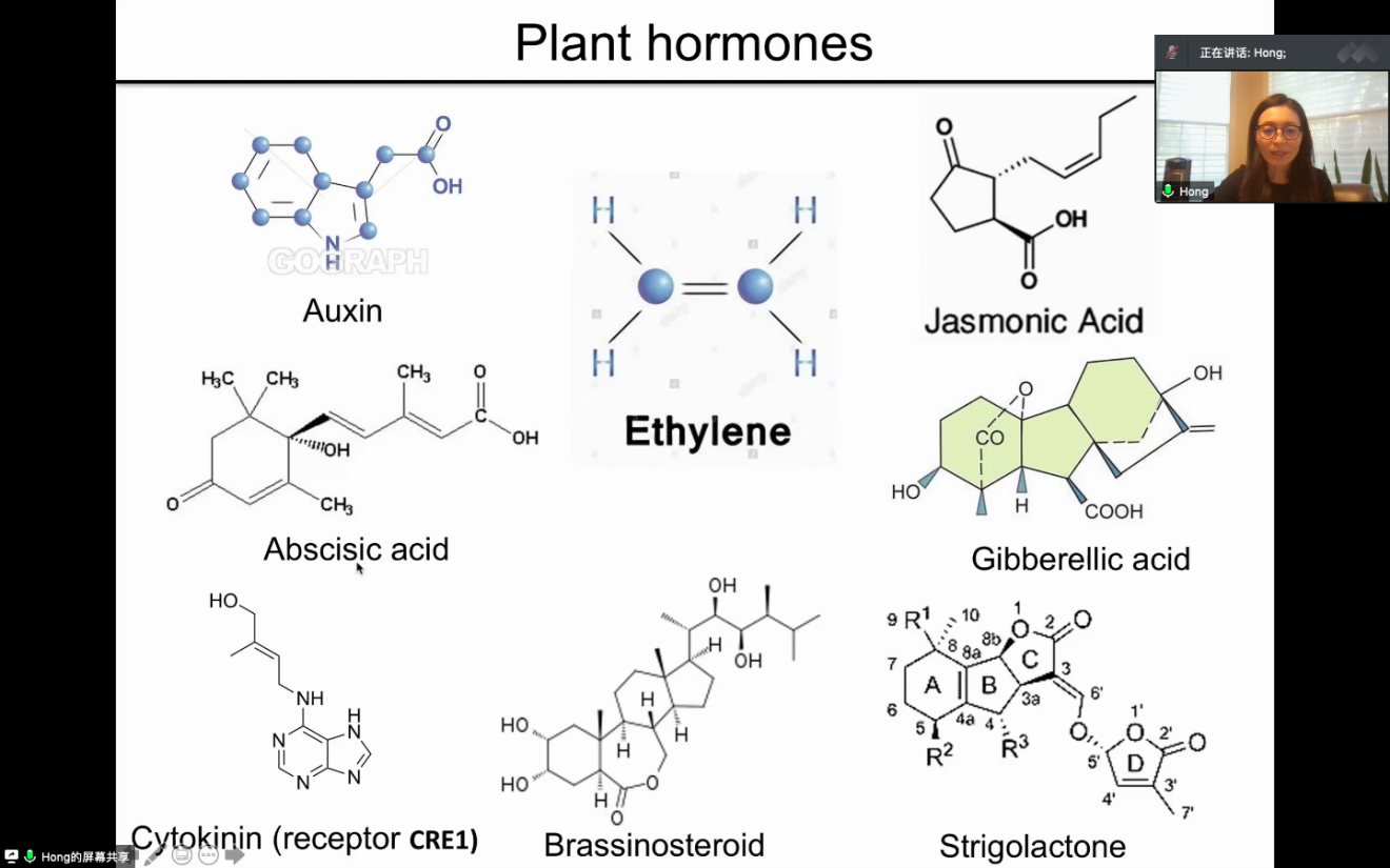 喬紅老師為大家介紹了植物激素以及乙烯信號(hào)通路的相關(guān)知識(shí)和前沿進(jìn)展。喬老師在課程中介紹了生長(zhǎng)素、赤霉素、茉莉酸、獨(dú)腳金內(nèi)酯、脫落酸、乙烯等激素的發(fā)現(xiàn)歷程和信號(hào)轉(zhuǎn)導(dǎo)通路,并比較了不同激素之間的信號(hào)轉(zhuǎn)導(dǎo)異同之處以及形成的調(diào)控網(wǎng)絡(luò),植物激素在農(nóng)作物、果蔬、花卉中的應(yīng)用。