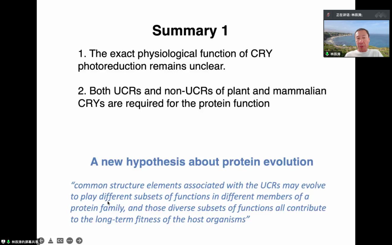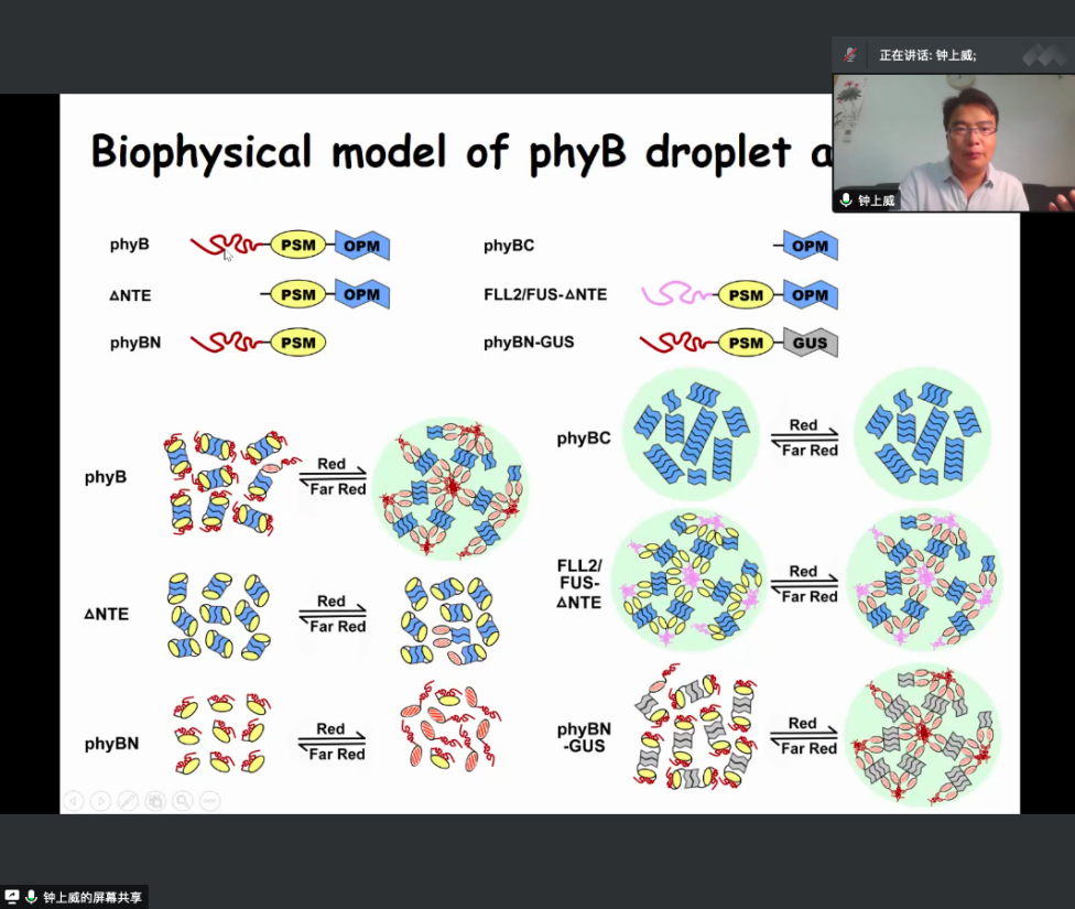 林辰濤老師從介紹植物光受體出發(fā),回顧了藍(lán)光受體的發(fā)現(xiàn)過(guò)程及其在動(dòng)植物中的不同功能,系統(tǒng)地講解了隱花色素的光還原反應(yīng)、聚合反應(yīng)、磷酸化反應(yīng)和相變反應(yīng)。