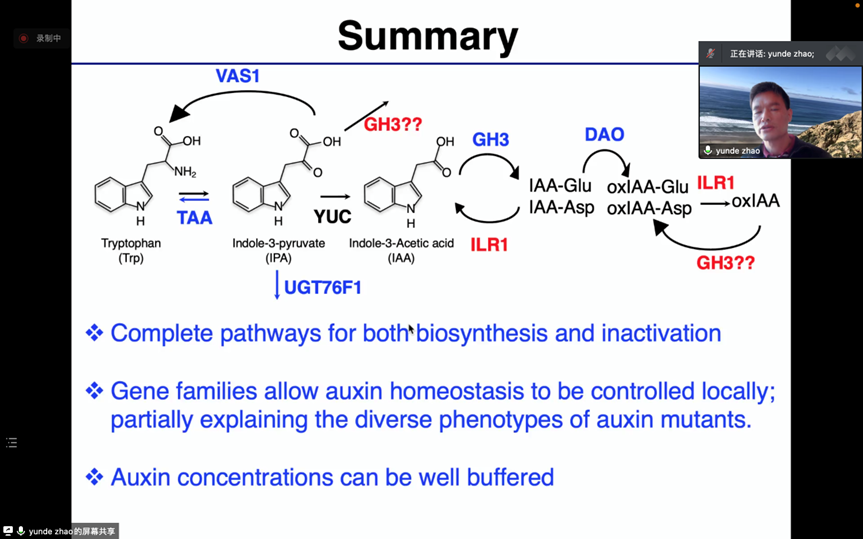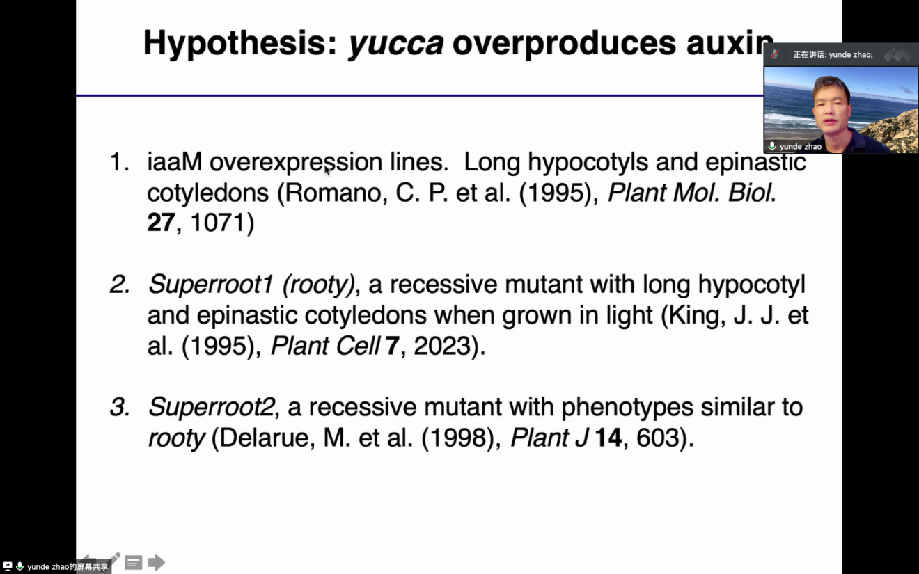 晚上的課程中,趙老師講解了生長(zhǎng)素相關(guān)的內(nèi)容,通過(guò)提出假設(shè)問(wèn)題,在從多個(gè)方面思考驗(yàn)證假說(shuō)是否為真。趙老師以YUCCA基因的研究為例,為大家介紹了不斷思考和求證的過(guò)程。同時(shí)趙老師也介紹了YUCCA基因家族中不同yucca缺失突變體組合對(duì)植物生長(zhǎng)發(fā)育的不同影響。