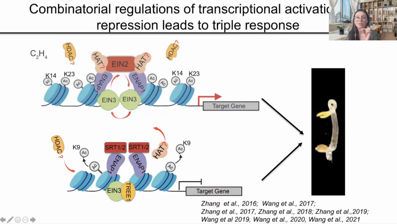 上午的研討會(huì)由林辰濤老師主持。首先由王志勇老師為大家講述糖和植物激素對(duì)植物生長(zhǎng)發(fā)育的調(diào)控,主要介紹了負(fù)責(zé)蛋白糖基化修飾的SPY和SEC所介導(dǎo)的GA和BR信號(hào)轉(zhuǎn)導(dǎo)機(jī)制及其對(duì)植物生長(zhǎng)發(fā)育的影響。此外王老師也列舉了研究中鑒定到的大量SPY和SEC的互作蛋白,涉及了根的發(fā)育、晝夜節(jié)律、開(kāi)花、植物免疫等多個(gè)方面,也包括植物激素、環(huán)境信號(hào)等多種內(nèi)外界信號(hào)途徑的因子,暗示了糖信號(hào)以及糖基轉(zhuǎn)移酶SPY和SEC對(duì)植物生長(zhǎng)發(fā)育的重要調(diào)控作用,也為其他學(xué)者提供了豐富的研究線(xiàn)索。接著欒升老師介紹了第二信使Ca2+對(duì)植物營(yíng)養(yǎng)吸收的調(diào)控,重點(diǎn)介紹了Ca2+受體CBLs和CIPKs的差異性互作對(duì)于植物鉀吸收的特異性調(diào)控。喬紅老師講述了乙烯信號(hào)轉(zhuǎn)導(dǎo)的表觀調(diào)控機(jī)制,介紹了以EIN2、EIN3為核心的ENAP1及SRT1和SRT2參與的組蛋白乙酰化和去乙酰化過(guò)程,也發(fā)現(xiàn)了一個(gè)新的轉(zhuǎn)錄抑制因子Tree1,闡明了乙烯響應(yīng)中轉(zhuǎn)錄激活和轉(zhuǎn)錄抑制的機(jī)制。董娟老師接著前期課程中的強(qiáng)烈安利,介紹了她們課題組的最新進(jìn)展,除蛋白磷酸酶BSL1時(shí)空特異的極性聚集于細(xì)胞膜上從而調(diào)節(jié)氣孔細(xì)胞命運(yùn)轉(zhuǎn)變外,也發(fā)現(xiàn)不同亞細(xì)胞定位的蛋白磷酸酶BSL家族通過(guò)去磷酸化不同的MAPK信號(hào)級(jí)聯(lián)途經(jīng)組分,最終差異性地調(diào)控SPEH蛋白穩(wěn)定性從而影響氣孔形成的機(jī)制。最后鐘上威老師介紹了phyB區(qū)分光照和溫度這兩個(gè)重要環(huán)境因子的機(jī)制,發(fā)現(xiàn)光照和溫度可以影響phyB相分離的形成和解離,phyB感知光照時(shí)依賴(lài)于構(gòu)象的變化解除N端對(duì)C端的抑制從而通過(guò)C端寡聚化驅(qū)動(dòng)相分離,而溫度的感知不依賴(lài)于構(gòu)象變化,通過(guò)NTE結(jié)構(gòu)域直接感知溫度變化并動(dòng)態(tài)調(diào)控phyB的相分離從而實(shí)現(xiàn)溫度感知。
