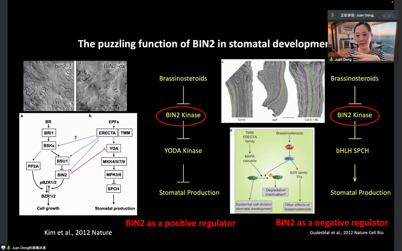 第一天的暑期課程由林辰濤老師主持,董娟老師主講。林老師向大家簡(jiǎn)要介紹了課程的歷史以及本期課程邀請(qǐng)的諸位老師及授課主題,之后董老師帶領(lǐng)大家走進(jìn)植物發(fā)育過(guò)程中的細(xì)胞生物學(xué)領(lǐng)域。上午的課程中,老師講解了植物氣孔發(fā)育的相關(guān)內(nèi)容,重點(diǎn)講解了氣孔細(xì)胞發(fā)育進(jìn)程中3個(gè)核心轉(zhuǎn)錄因子SPCH、MUTE和FAMA的發(fā)現(xiàn)過(guò)程以及作用機(jī)制, 介紹了在感知環(huán)境變化及細(xì)胞間的交流中配體與受體結(jié)合向下游傳遞氣孔發(fā)育信號(hào)的多樣性,如即使是同一個(gè)receptor,TMM,在植物不同的發(fā)育部位對(duì)氣孔發(fā)育的調(diào)控也是不同。