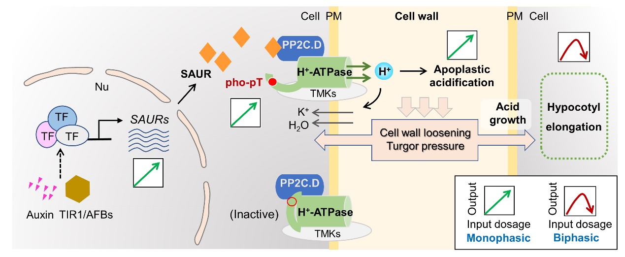生長(zhǎng)素是第一個(gè)被發(fā)現(xiàn)的植物激素,對(duì)植物生長(zhǎng)發(fā)育過(guò)程至關(guān)重要,廣泛參與調(diào)控細(xì)胞分裂、延展和分化等基本生物過(guò)程。生長(zhǎng)素在調(diào)控器官生長(zhǎng)時(shí)具有“劑量效應(yīng)”(又稱“雙重效應(yīng)”),具體表現(xiàn)為低濃度的生長(zhǎng)素促進(jìn)生長(zhǎng)而高濃度的生長(zhǎng)素抑制生長(zhǎng)。生長(zhǎng)素的這一特征發(fā)現(xiàn)已有近九十年,而背后的分子機(jī)制還不清楚。此外,生長(zhǎng)素調(diào)控器官伸長(zhǎng)的效應(yīng)還受光等環(huán)境信號(hào)影響,如高濃度的生長(zhǎng)素在暗中抑制擬南芥下胚軸伸長(zhǎng),而在光下卻促進(jìn)下胚軸伸長(zhǎng),這一現(xiàn)象發(fā)現(xiàn)多年,背后的分子機(jī)制也一直不清楚。