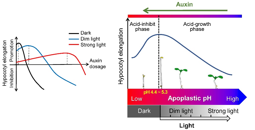 該研究發(fā)現(xiàn),生長(zhǎng)素以劑量依賴的方式誘導(dǎo)SAUR家族基因表達(dá)。隨著生長(zhǎng)素劑量的增加,SAUR家族蛋白水平逐漸積累,促使質(zhì)膜質(zhì)子泵H+-ATPase活性被逐漸激活,進(jìn)而促使下胚軸表皮細(xì)胞質(zhì)外體被逐漸酸化。根據(jù)酸生長(zhǎng)理論,質(zhì)外體適度酸化促進(jìn)細(xì)胞延展,而該研究發(fā)現(xiàn)當(dāng)質(zhì)外體酸化到一定程度則抑制細(xì)胞延展。因此,生長(zhǎng)素的雙重效應(yīng)發(fā)生在生長(zhǎng)素介導(dǎo)的轉(zhuǎn)錄重編程之后,取決于細(xì)胞對(duì)質(zhì)外體酸化程度(pH)的響應(yīng)(圖1)。光信號(hào)促使下胚軸表皮細(xì)胞質(zhì)外體pH升高,抵消生長(zhǎng)素誘導(dǎo)的質(zhì)外體的過(guò)度酸化,使得生長(zhǎng)素在光下促進(jìn)下胚軸伸長(zhǎng)(圖2)。