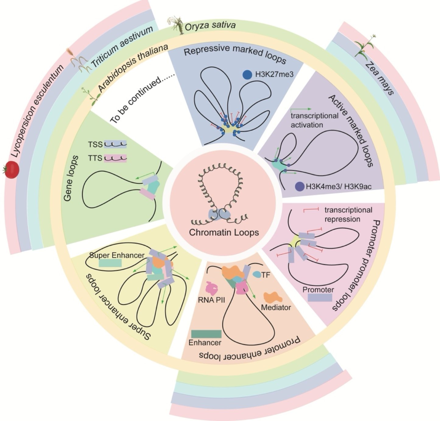隨著上述技術(shù)在植物中的廣泛使用,研究人員不僅鑒定出大尺度的染色質(zhì)疆域(Territory)和區(qū)室(Compartment),也逐漸識(shí)別出多種小尺度高級(jí)結(jié)構(gòu),包括拓?fù)湎嚓P(guān)結(jié)構(gòu)域(TAD)、“噴泉”(Fountain)、“結(jié)”(KNOT),以及最基礎(chǔ)的染色質(zhì)環(huán)(圖二)。此外,根據(jù)在細(xì)胞核中的空間位置,還鑒定出核仁相關(guān)結(jié)構(gòu)域(NAD)和核纖層相關(guān)結(jié)構(gòu)域(LAD)。這些結(jié)構(gòu)在動(dòng)植物間并非完全保守,文章詳細(xì)比較了它們?cè)趦深?lèi)生物中的差異,特別強(qiáng)調(diào)了基于不同技術(shù)所識(shí)別出的染色質(zhì)環(huán),并將其分為五類(lèi):抑制標(biāo)記環(huán)、激活標(biāo)記環(huán)、啟動(dòng)子相關(guān)環(huán)、基因環(huán)和其他類(lèi)型環(huán),進(jìn)一步闡述了它們?cè)诨虮磉_(dá)調(diào)控中的功能(圖三)。