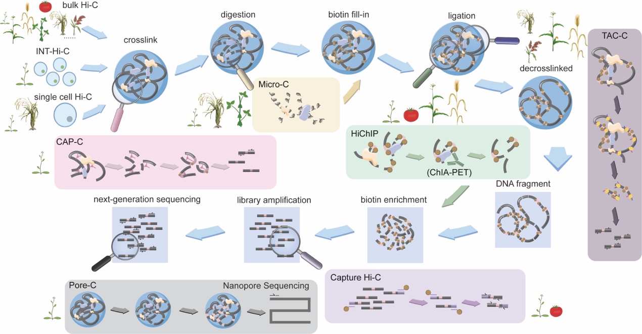 工欲善其事,必先利其器。染色質(zhì)高級(jí)結(jié)構(gòu)的深入研究高度依賴實(shí)驗(yàn)技術(shù)的不斷發(fā)展,相關(guān)技術(shù)可大致分為成像技術(shù)與測(cè)序技術(shù)兩大類(lèi)。然而,由于植物組織和細(xì)胞具有獨(dú)特的組成和結(jié)構(gòu)(如細(xì)胞壁和豐富的次級(jí)代謝產(chǎn)物),高分辨率成像技術(shù)(如STORM、PALM、DNA-PAINT)在植物中的應(yīng)用仍較為受限。相比之下,基于高通量測(cè)序的傳統(tǒng)Hi-C及其衍生技術(shù)已在擬南芥以及水稻、小麥、玉米、大豆等重要經(jīng)濟(jì)作物中廣泛應(yīng)用。其中,CAP-C、Micro-C和TAC-C更擅長(zhǎng)捕獲短距離互作;而Capture Hi-C、HiChIP和ChIA-PET則更適用于長(zhǎng)距離互作檢測(cè)。以上技術(shù)僅能檢測(cè)兩位點(diǎn)間的互作,而基于長(zhǎng)讀段測(cè)序的Pore-C可識(shí)別多位點(diǎn)互作。此外,單細(xì)胞Hi-C技術(shù)在擬南芥和水稻中已有初步嘗試,但其分辨率仍有待提高。文章對(duì)這些技術(shù)的原理與特點(diǎn)進(jìn)行了全面梳理與總結(jié)(圖一)。