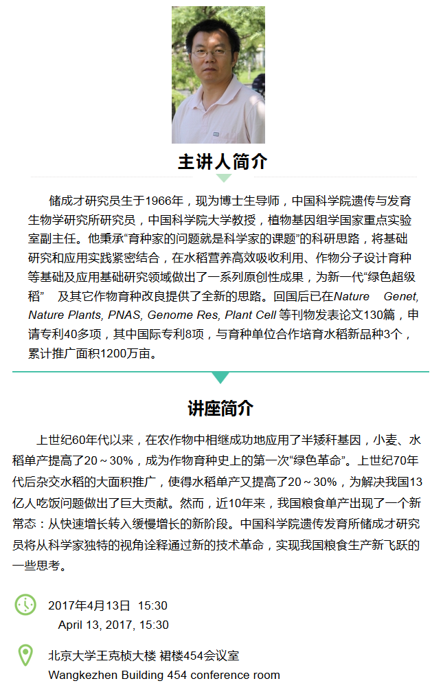 【北京大學現(xiàn)代農(nóng)業(yè)講座 第十七講】分子模塊設計育種:從實驗室到田間——儲成才 研究員 (中科院遺傳與發(fā)育生物學研究所)