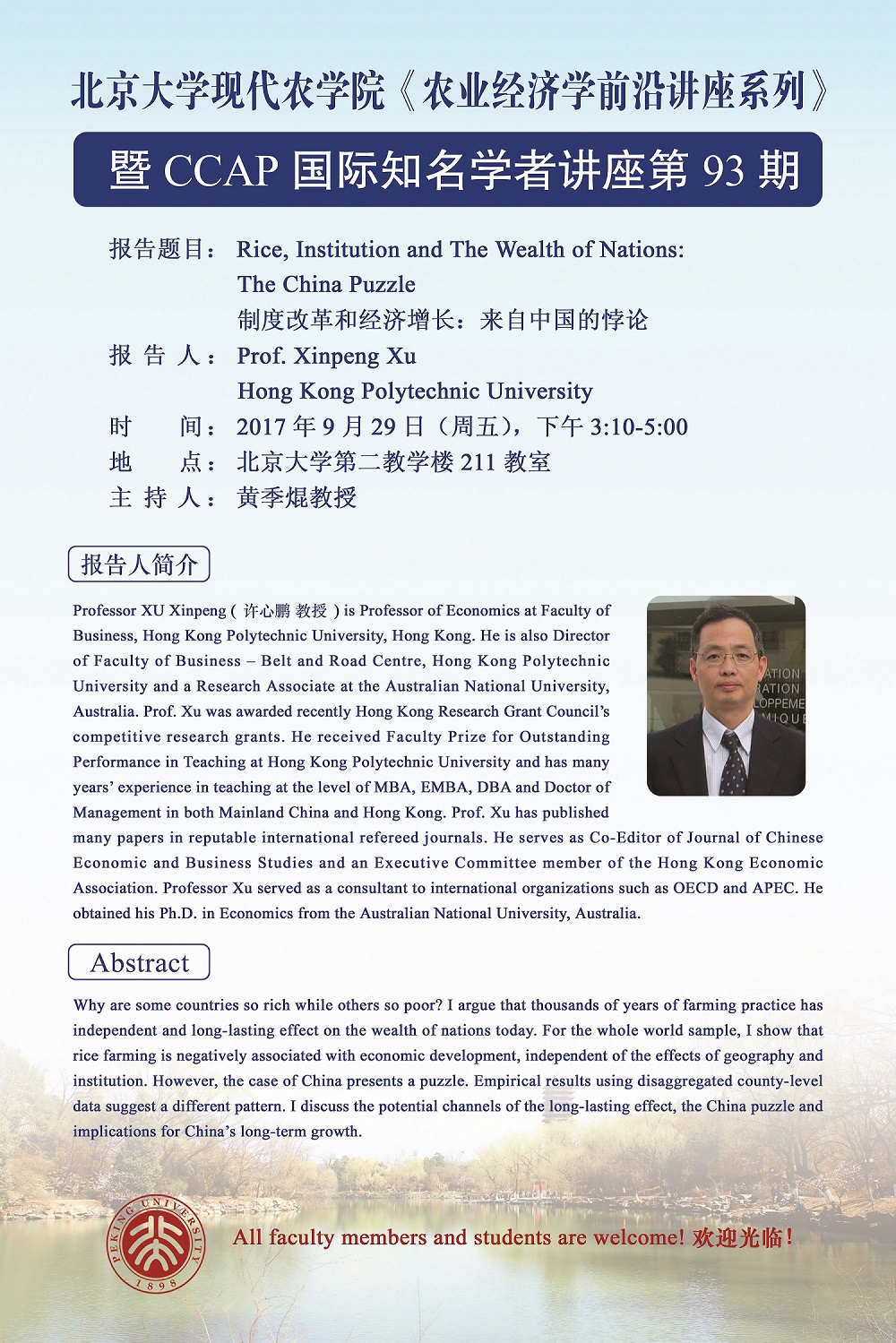 北京大學(xué)現(xiàn)代農(nóng)學(xué)院《農(nóng)業(yè)經(jīng)濟(jì)學(xué)前沿講座系列》 暨CCAP國際知名學(xué)者講座第93期——Prof. Xinpeng Xu, Hong Kong Polytechnic University 2017-09-29 來源: 作者: