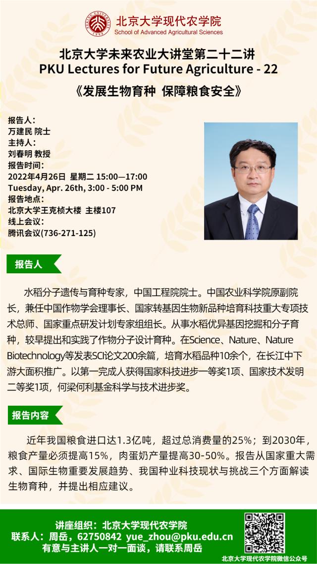 講座通知:北京大學未來農(nóng)業(yè)大講堂第二十二講——發(fā)展生物育種 保障糧食安全