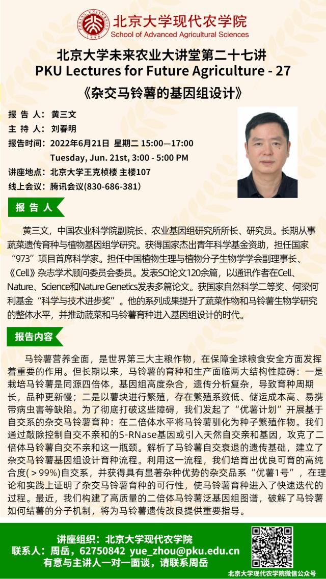 講座通知:北京大學(xué)未來農(nóng)業(yè)大講堂第二十七講——雜交馬鈴薯的基因組設(shè)計(jì)
