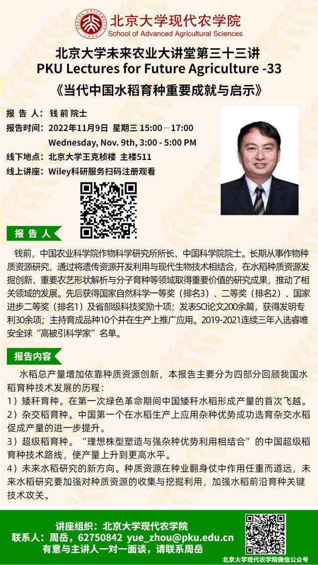 講座通知:北京大學(xué)未來農(nóng)業(yè)大講堂第三十三講——當代中國水稻育種重要成就與啟示