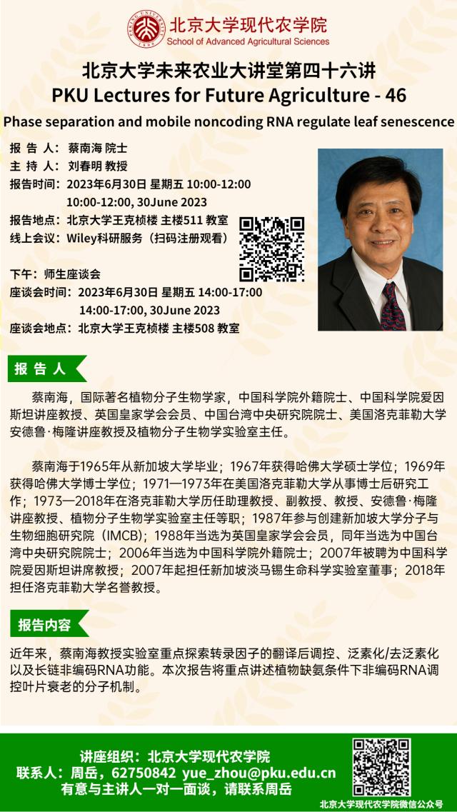 講座通知:北京大學未來農業(yè)大講堂第四十六講——Phase separation and mobile noncoding RNA regulate leaf senescence