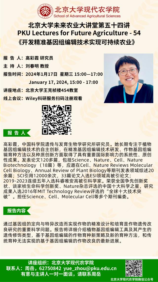 講座通知:北京大學(xué)未來農(nóng)業(yè)大講堂第五十四講——開發(fā)精準(zhǔn)基因組編輯技術(shù)實現(xiàn)可持續(xù)農(nóng)業(yè)