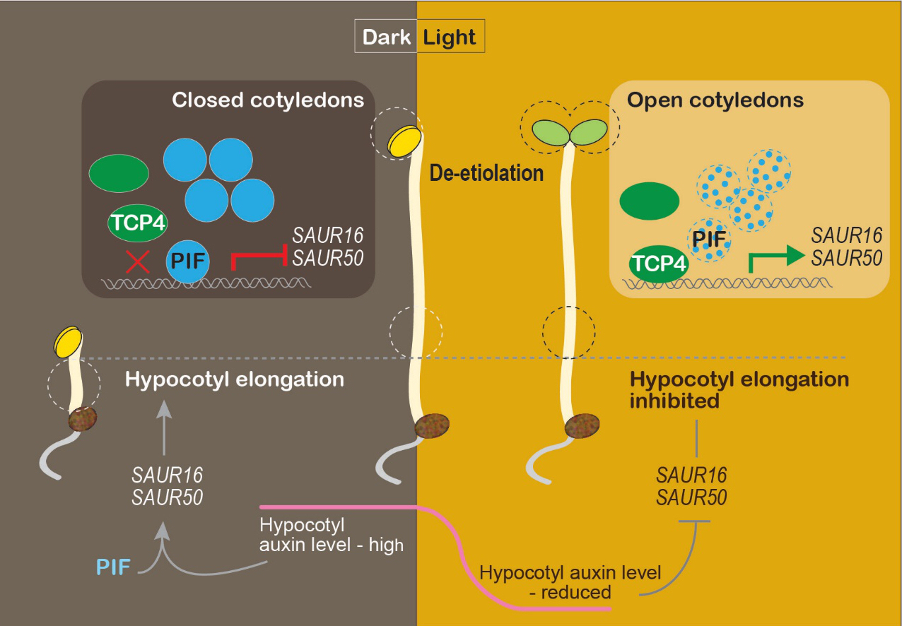 北京大學(xué)現(xiàn)代農(nóng)學(xué)院、生命科學(xué)學(xué)院鄧興旺/陳浩東團(tuán)隊(duì)與耶魯大學(xué)魏寧研究組近期的合作研究發(fā)現(xiàn),在擬南芥幼苗時(shí)期,一類TCP家族轉(zhuǎn)錄因子特異性地在子葉中表達(dá),激活 SAUR16/50 基因的轉(zhuǎn)錄 , 從而促進(jìn)子葉的打開。TCP4可以直接結(jié)合這些 SAUR 基因的啟動子并且激活其表達(dá),但是暗中高表達(dá)的PIFs蛋白結(jié)合在這些 SAUR 基因的啟動子上,抑制了TCP4蛋白的結(jié)合。光信號引起PIFs蛋白的降解,解除其抑制功能,使TCP4蛋白得以結(jié)合并且激活這些 SAUR 基因的表達(dá)。綜合起來,子葉發(fā)育調(diào)控因子TCP4負(fù)責(zé)在子葉中特異性激發(fā) SAUR16/50 基因的表達(dá),而光信號轉(zhuǎn)錄因子PIF3決定了光信號對TCP4- SAUR16/50 轉(zhuǎn)錄裝置的調(diào)控,以實(shí)現(xiàn)子葉特異性光誘導(dǎo),從而促進(jìn)了脫黃化過程中子葉的打開。