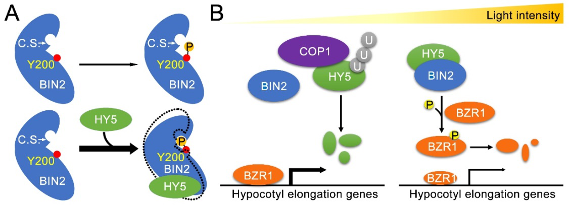 光是植物賴以生存的能量來源與關(guān)鍵生長發(fā)育信號。模式植物擬南芥幼苗在光下呈現(xiàn)短胚軸、子葉延展等典型特征。近二十年的研究工作構(gòu)建了以HY5 (ELONGATED HYPOCOTYL 5) 為中央樞紐的光信號轉(zhuǎn)導(dǎo)網(wǎng)絡(luò),奠定了HY5作為轉(zhuǎn)錄因子的“明星”地位。近期鄧興旺實驗室朱丹萌課題組研究發(fā)現(xiàn)HY5在光下還可通過蛋白-蛋白直接互作增強BIN2 (BRASSINOSTEROID-INSENSITIVE 2) 的激酶活性,抑制幼苗下胚軸伸長。